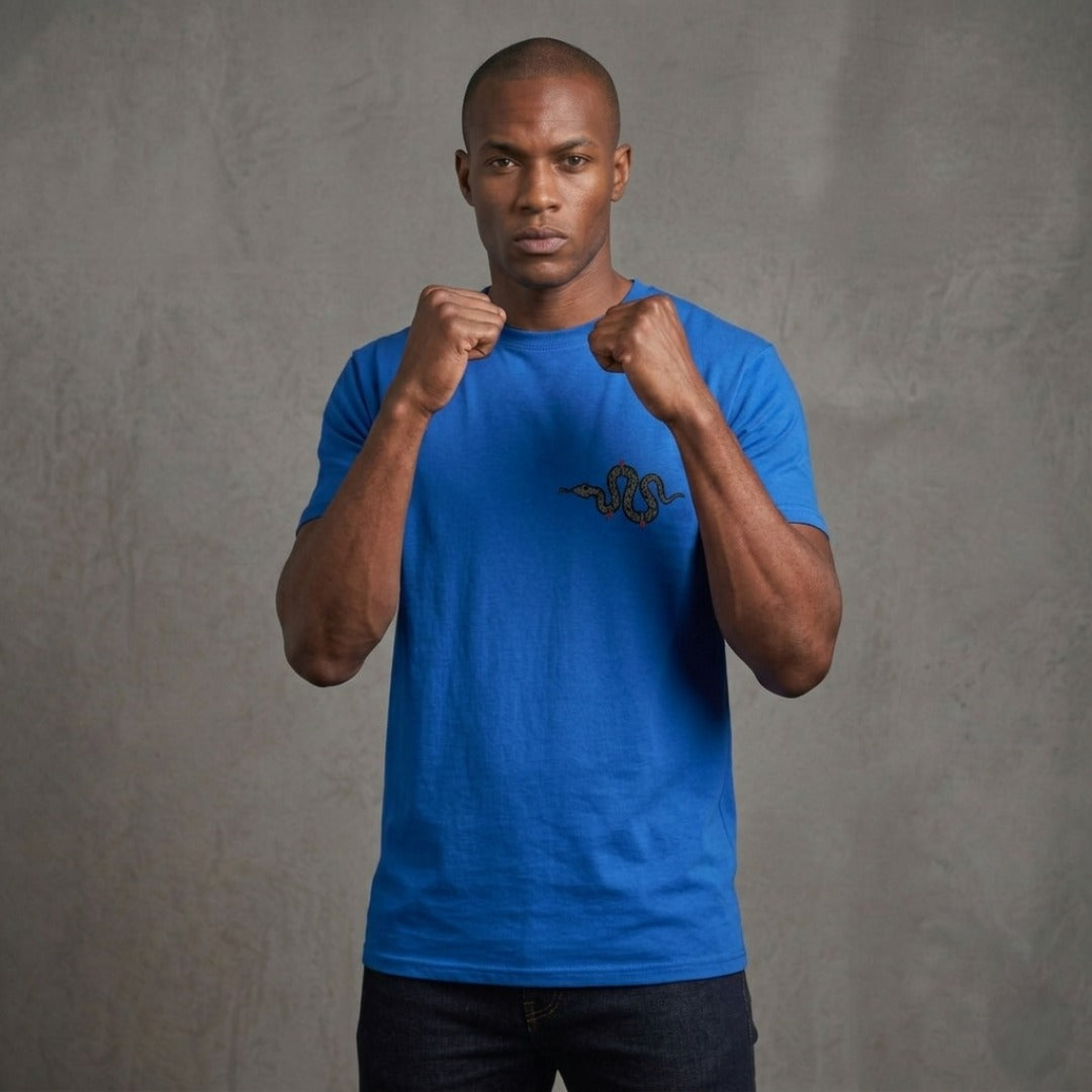 Part of the Inked collection, this blue tee features a hand-illustrated coiled snake graphic on the chest and a bold back print with red Fumetsu gothic script and a detailed snake medallion. Made from 100% ring-spun cotton with shoulder-to-shoulder taping and a regular fit, suitable for post-training wear or everyday casual use.